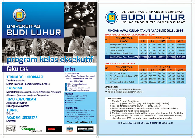 Berikut dibawah ini adalah hal-hal yang bisa di jadikan sebagai sumber infomasinya Pendaftaran dan Biaya Kuliah Universitas Budi Luhur 2016 :